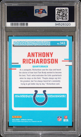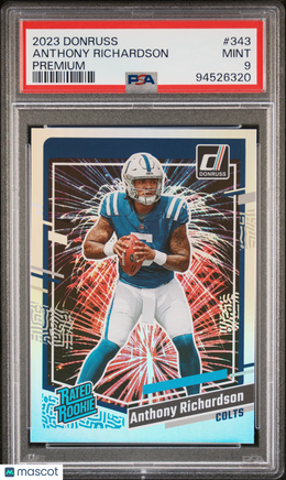 You are purchasing a 2023 Panini Donruss Anthony Richardson Rated Rookie Premium PSA 9. You will receive the exact item in the photographs. Raw cards may include imperfections like edge and/or corner wear, light scratches and/or dimples. Graded cards may include light scratches and/or scuffs on the slabs. Please look over the pictures closely And feel free to reach out with any questions. Thank you for looking. Listed With Mascot.