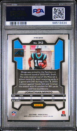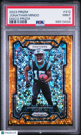 You are purchasing a 2023 Panini Prizm Jonathan Mingo Disco Rookie PSA 9. You will receive the exact item in the photographs. Raw cards may include imperfections like edge and/or corner wear, light scratches and/or dimples. Graded cards may include light scratches and/or scuffs on the slabs. Please look over the pictures closely And feel free to reach out with any questions. Thank you for looking. Listed With Mascot.