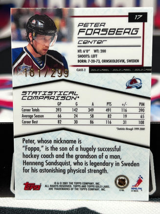 You are purchasing a 2001 Topps Gold Label Peter Forsberg Class 2 Gold /299 . You will receive the exact item in the photographs. Raw cards may include imperfections like edge and/or corner wear, light scratches and/or dimples. Graded cards may include light scratches and/or scuffs on the slabs. Please look over the pictures closely And feel free to reach out with any questions. Thank you for looking. Listed With Mascot.