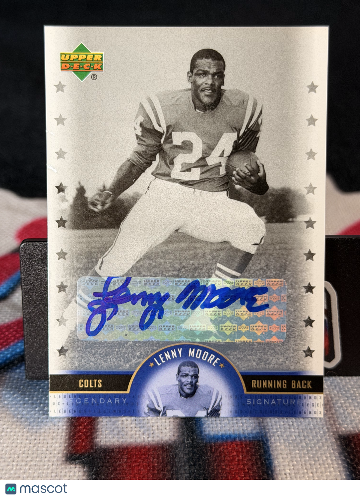 You are purchasing a 2005 Upper Deck Legends Lenny Moore Legendary Signatures. You will receive the exact item in the photographs. Raw cards may include imperfections like edge and/or corner wear, light scratches and/or dimples. Graded cards may include light scratches and/or scuffs on the slabs. Please look over the pictures closely And feel free to reach out with any questions. There are a couple small dents on the card. Thank you for looking. Listed With Mascot.