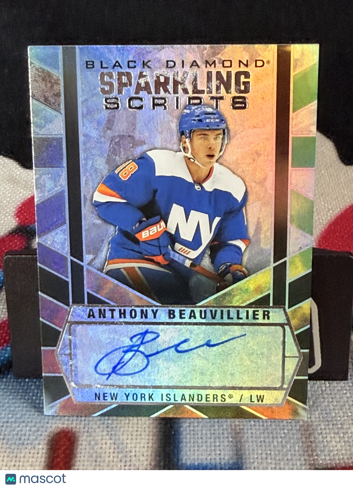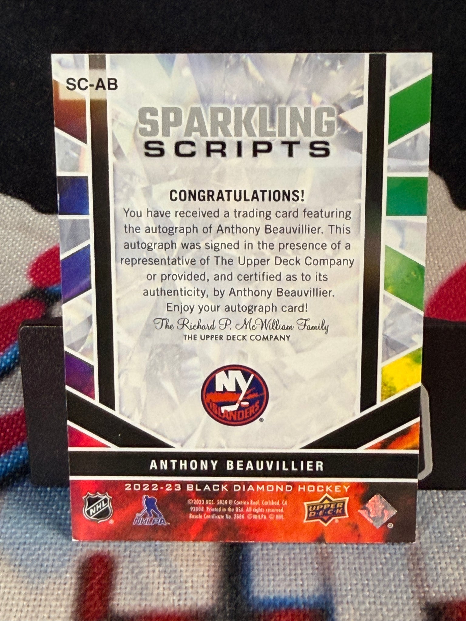 You are purchasing a 2022-23 Upper Deck Black Diamond Sparkling Scripts Anthony Beauvillier. You will receive the exact item in the photographs. Raw cards may include imperfections like edge and/or corner wear, light scratches and/or dimples. Graded cards may include light scratches and/or scuffs on the slabs. Please look over the pictures closely And feel free to reach out with any questions. Thank you for looking. Listed With Mascot.