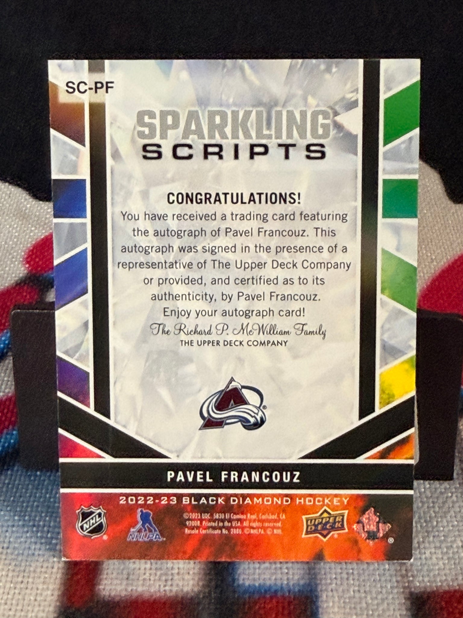 You are purchasing a 2022-23 Upper Deck Black Diamond Sparkling Scripts Pavel Francouz. You will receive the exact item in the photographs. Raw cards may include imperfections like edge and/or corner wear, light scratches and/or dimples. Graded cards may include light scratches and/or scuffs on the slabs. Please look over the pictures closely And feel free to reach out with any questions. Thank you for looking. Listed With Mascot.