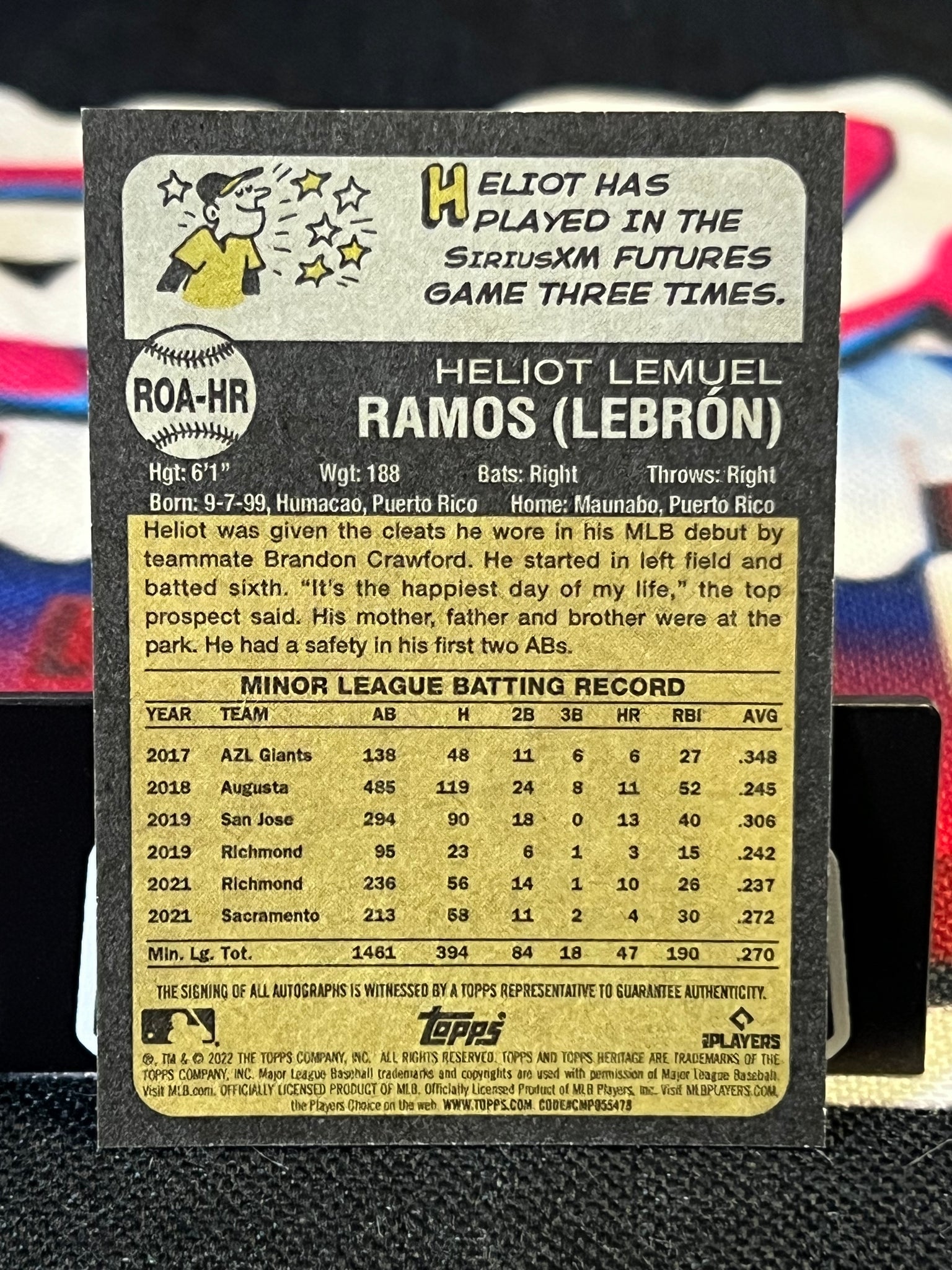 You are purchasing a 2022 Topps Heritage Heliot Ramos Auto Rookie. You will receive the exact item in the photographs. Raw cards may include imperfections like edge and/or corner wear, light scratches and/or dimples. Graded cards may include light scratches and/or scuffs on the slabs. Please look over the pictures closely And feel free to reach out with any questions. Thank you for looking. Listed With Mascot.