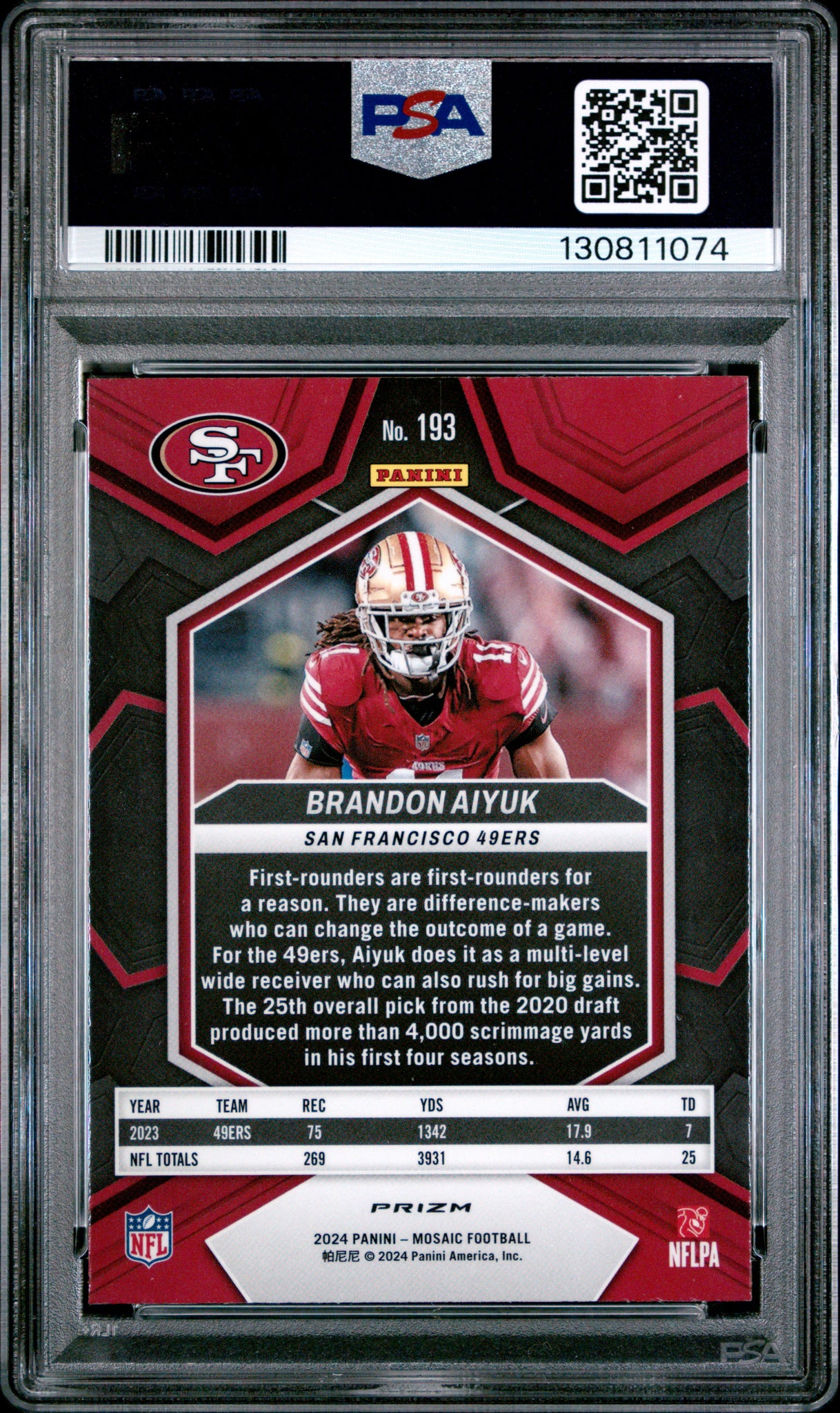 You are purchasing a 2024 Panini Mosaic Brandon Aiyuk Reactive Blue PSA 10. You will receive the exact item in the photographs. Raw cards may include imperfections like edge and/or corner wear, light scratches and/or dimples. Graded cards may include light scratches and/or scuffs on the slabs. Please look over the pictures closely And feel free to reach out with any questions. Thank you for looking. Listed With Mascot.