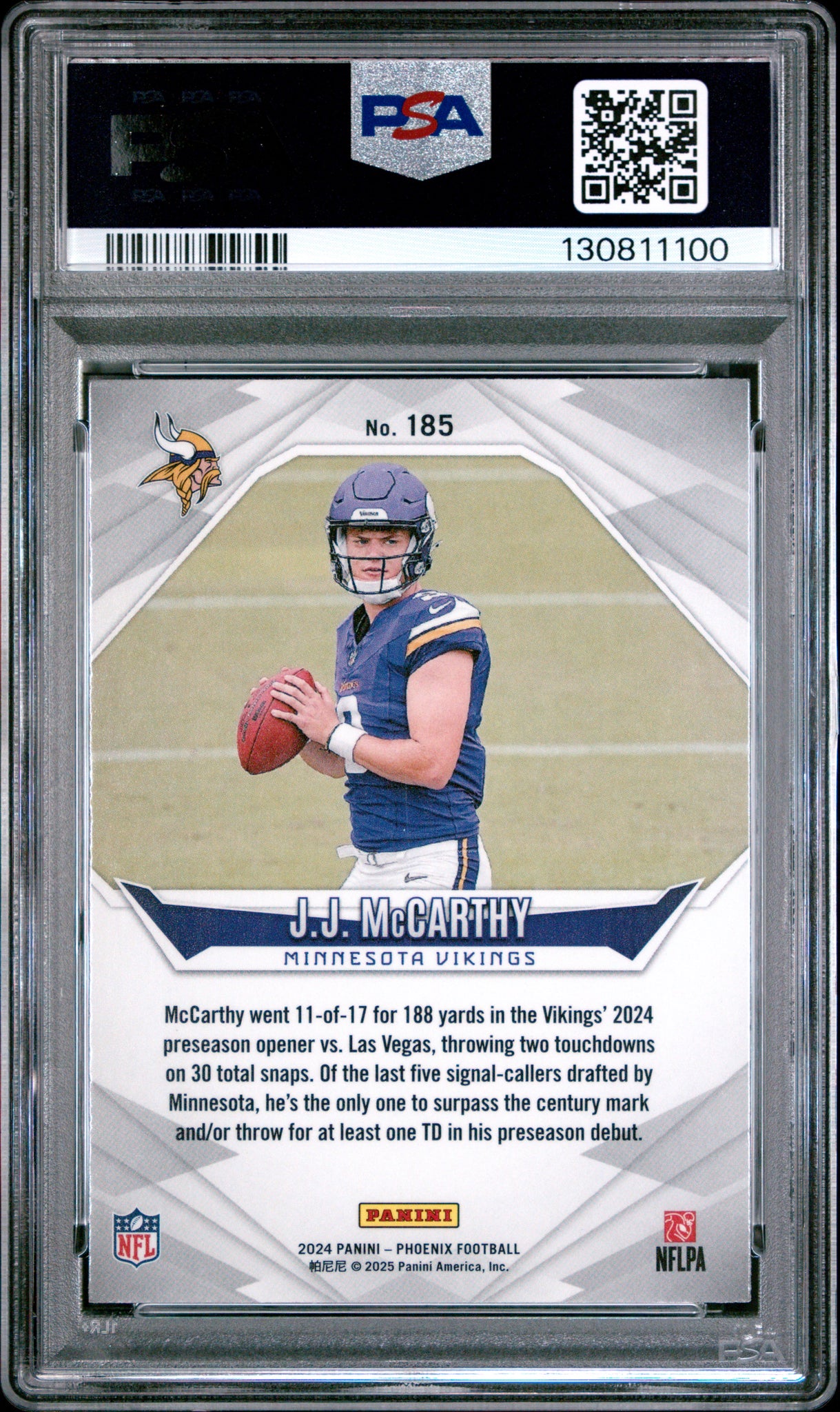 You are purchasing a 2024 Panini Phoenix JJ Mccarthy Orange Rookie PSA 8. You will receive the exact item in the photographs. Raw cards may include imperfections like edge and/or corner wear, light scratches and/or dimples. Graded cards may include light scratches and/or scuffs on the slabs. Please look over the pictures closely And feel free to reach out with any questions. Thank you for looking. Listed With Mascot.