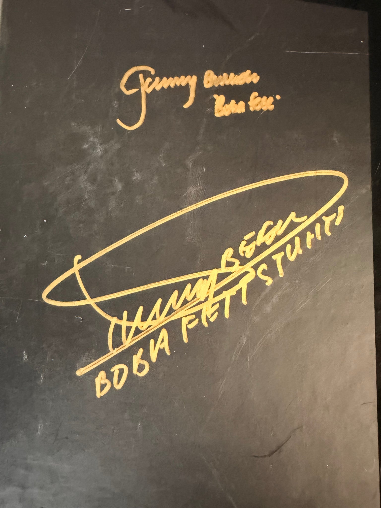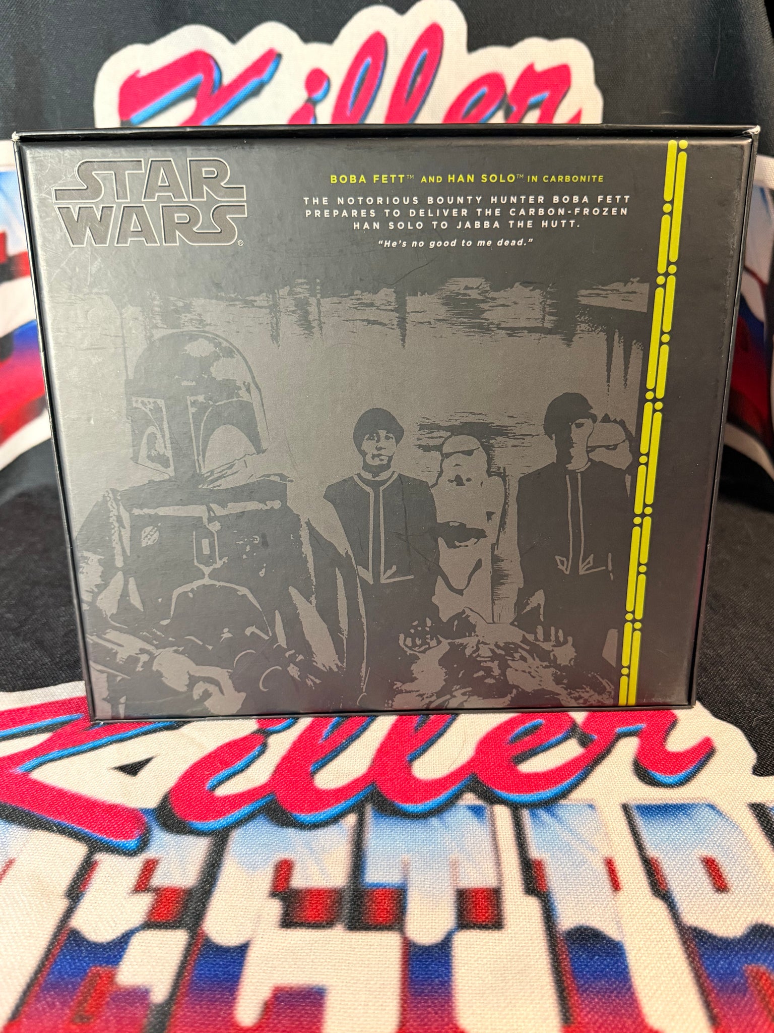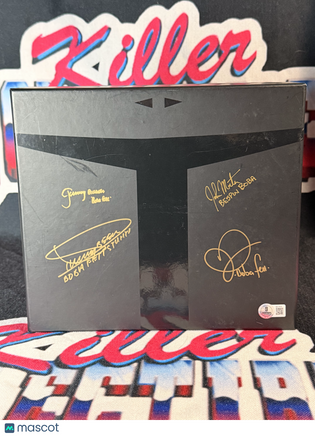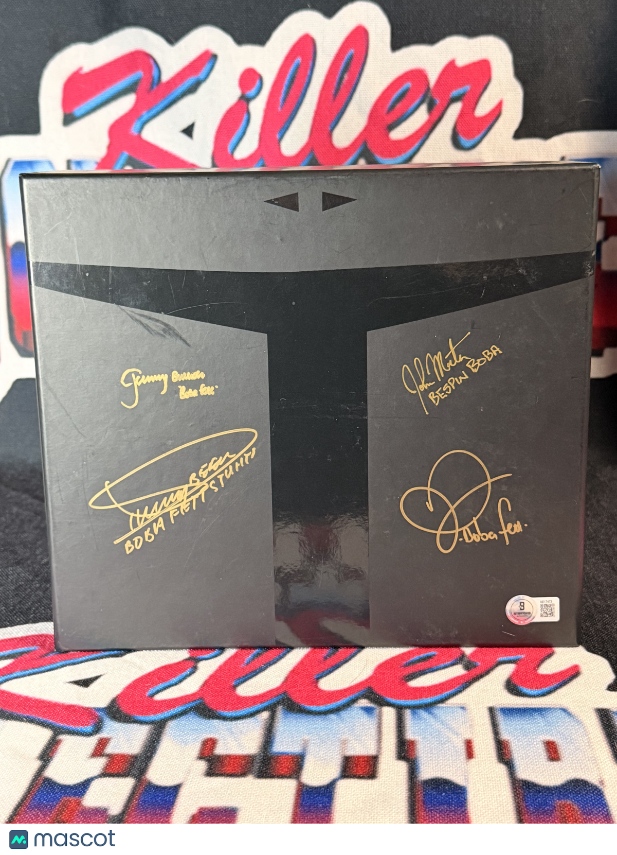 Awesome collectible signed by 4 actors who played Boba Fett! SDCC Star Wars The Black Series Boba Fett and Han Solo in carbonite box set, autographed by Jeremy Bulloch, Dickey Beer, Daniel Logan, and John Morton. Authenticated by Beckett. Box has minor marks/scratches and shelf wear. Listed With Mascot.